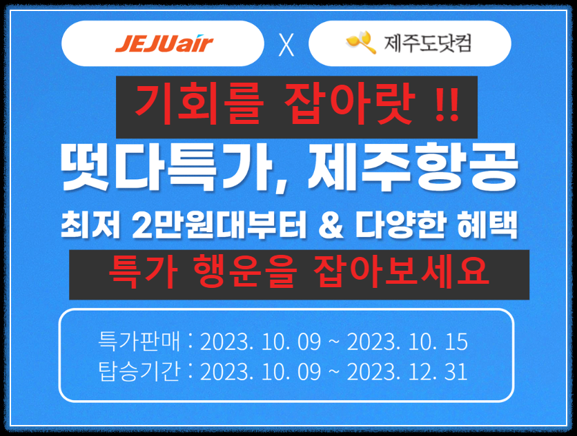 제주도여행을 준비중이신가요 제주 자유여행에서 관광여행까지 모두 다 한 곳에서 편리하게 진행해 보시는 건 어떨까요? 제주도 여행 가시려면 떴다 특가 제주항공 최저 2만 원부터 행운을 가지실 수 있습니다. 다양한 혜택을 꼭 놓치지 마시고 행운을 잡으시기 바랍니다